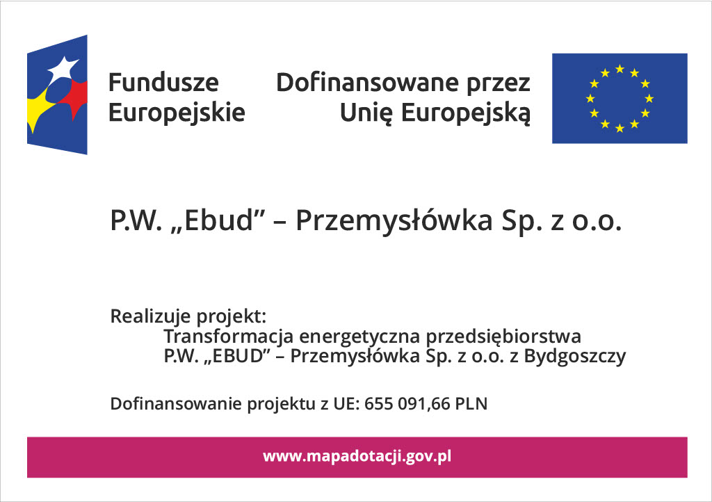 Celem projektu P.W. „EBUD” – Przemysłówka Sp. z o.o. jest zwiększenie efektywności energetycznej zakładu firmy w Bydgoszczy poprzez termomodernizację budynku biurowego, termomodernizację budynku warsztatu, modernizację oświetlenia oraz montaż instalacji fotowoltaicznej. Zakres prac wynika ze zrealizowanych audytów energetycznych i audytu efektywności energetycznej oraz obejmuje kwalifikowane do dofinansowania roboty budowlane związane z ociepleniem dachów i ścian zewnętrznych, wymianę oświetlenia na LED oraz budowę instalacji fotowoltaicznej o mocy ok. 28 kWp na potrzeby własne. W rezultacie wykonania zaplanowanych prac o charakterze przedsięwzięć termomodernizacyjnym nastąpi zmniejszenie zużycia energii pierwotnej o 359,80 MWh/rok, co daje poprawę o 74,36% w stosunku do stanu sprzed realizacji projektu.